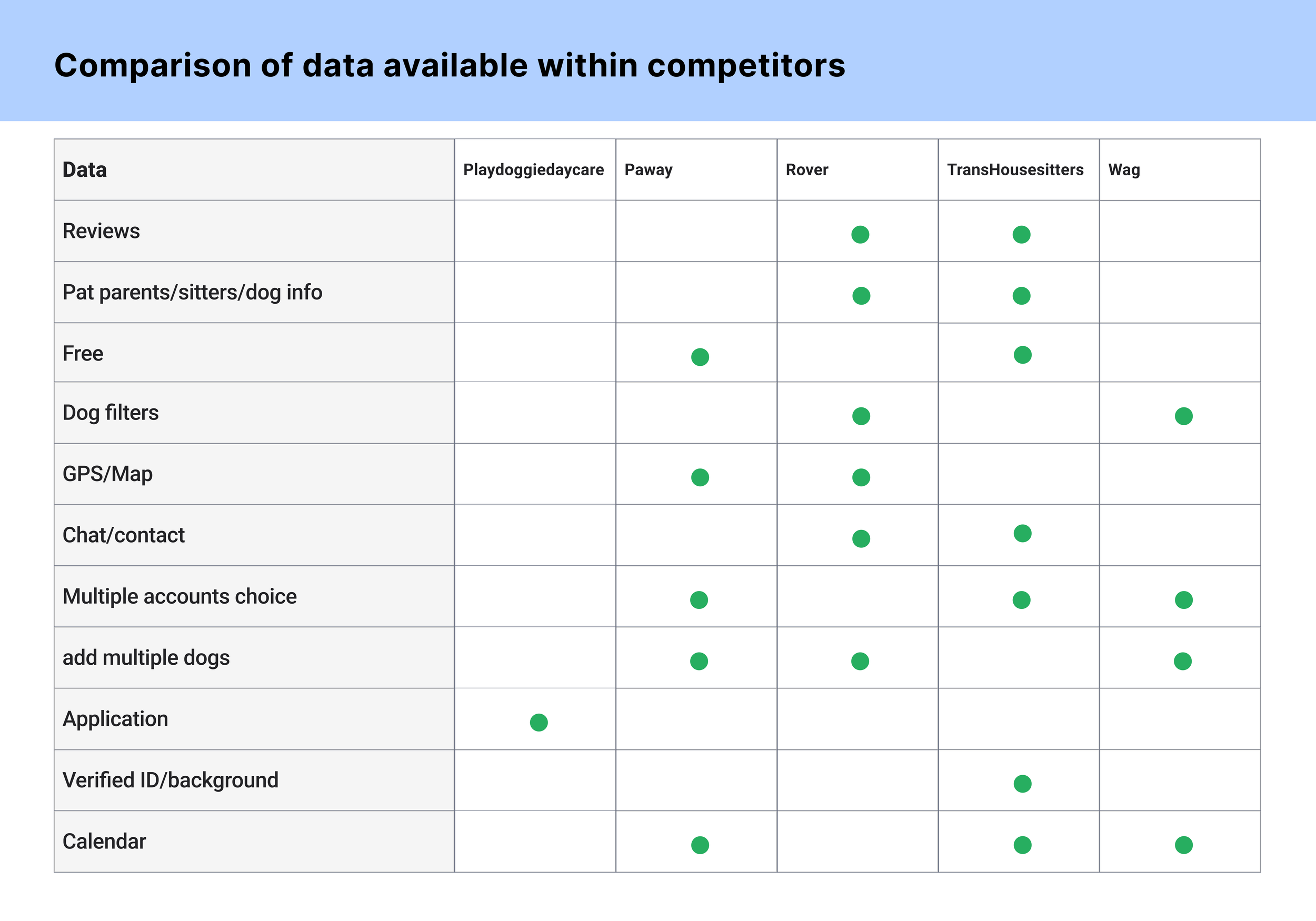 Prior to delving into information architecture and design, I decided to explore how other dog-related and alternative dating app competitors structured their applications and attracted users. To gain a comprehensive understanding of the market landscape and identify areas of strength and improvement, I conducted a competitive analysis. This analysis served as the foundation for creating a unique and standout product. Based on the insights obtained from the competitive analysis, the key findings were as follows: